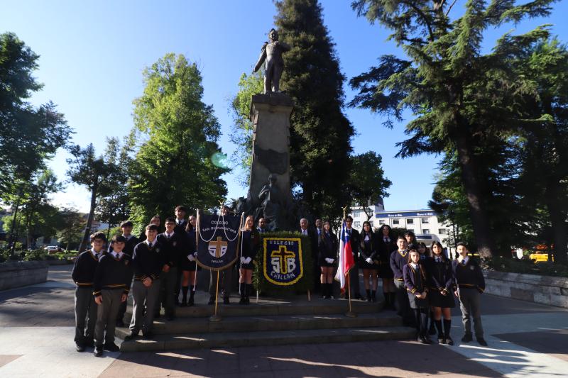 El viernes 24 el colegio culminó su aniversario con tres actividades muy importantes. La mañana comenzó con la entrega de una ofrenda floral a la estatua de Bernardo O'Higgins en el Plaza de Armas. A ella asistió el Director Hugo Flores Oyarzún, el Jefe de UTP Luis Maldonado Cárcamo, el Coordinador de Pastoral Pedro Osses Gutiérrez, el Orientador Guillermo Betancourt Jara, estudiantes Abanderados y Portaestandarte, René Amdan -Ingeniero Informático del colegio y Juan Carlos Vera -Evaluador del colegio- y un grupo de estudiantes representantes de diferentes cursos.