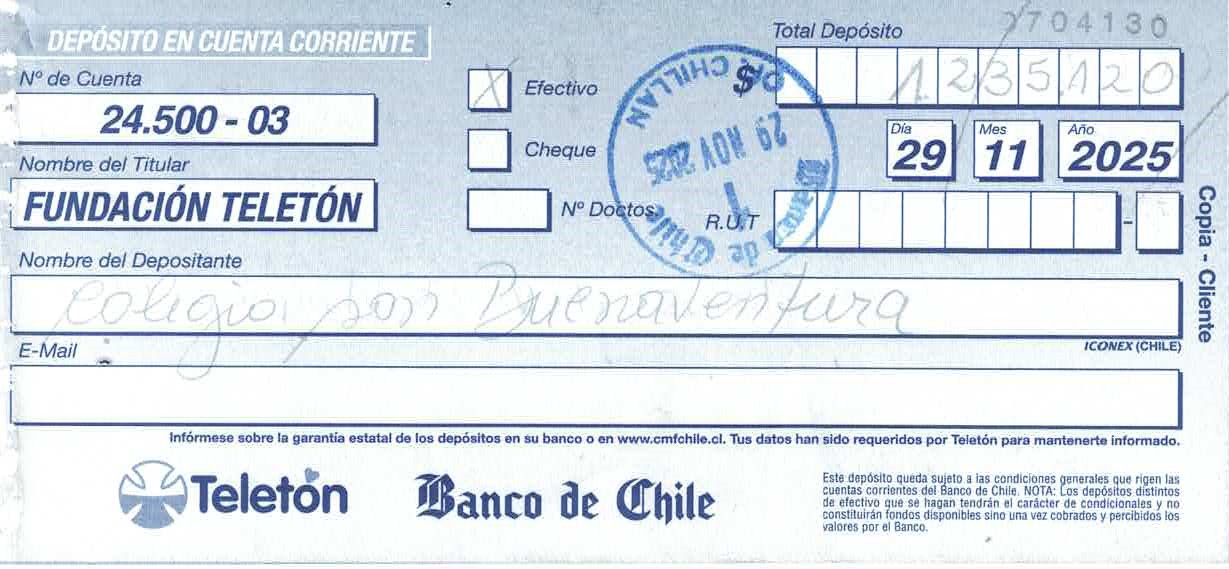 Las distintas actividades preparadas este año daban indicios de que se iba llegar a la meta superando la tendencia de años anteriores ($620.760 en 2023 y $640.760 en 2024), pero la sorpresa fue mayor ya que el monto alcanzado llegó a los siete dígitos. Así el aporte del colegio a la cuenta 24.500-03 del Banco de Chile fue de $1.235.120.