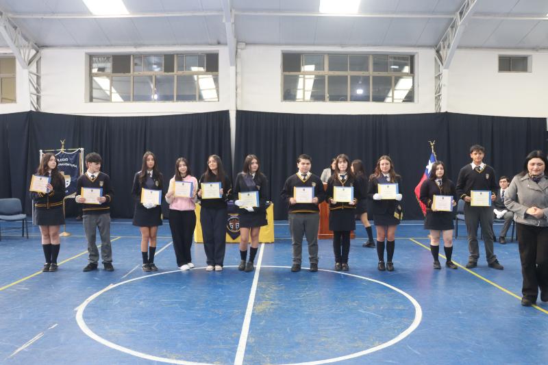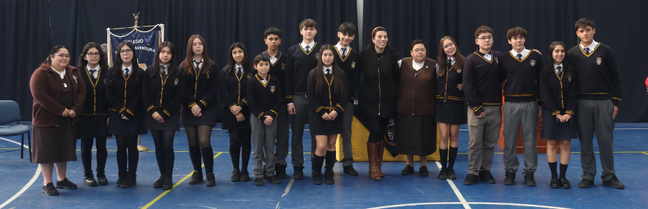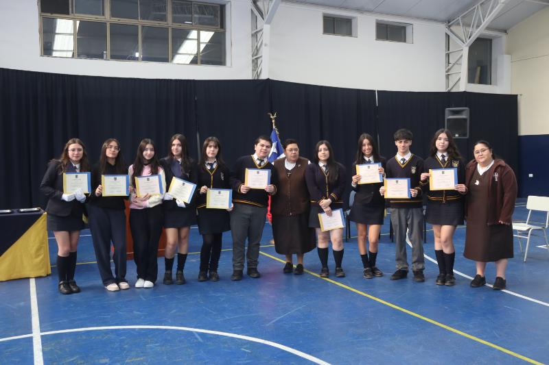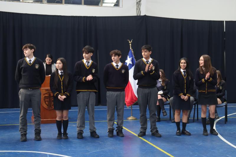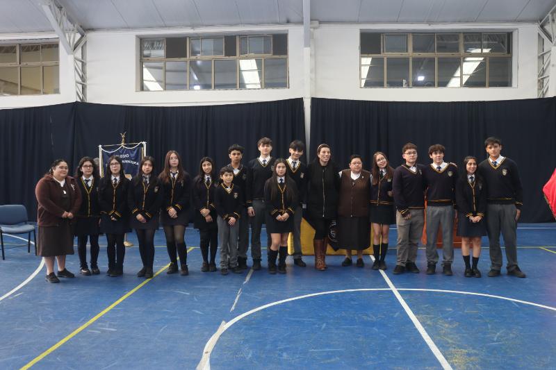 A la ceremonia asistieron los cursos desde 7° Básico a 4° Medio, los abanderados y portaestandartes del colegio, docentes y autoridades del colegio. En forma especial contamos con la presencia de Hermana Carmen González Ahumada -Representante Legal de la Fundación- y Hermana Flor.