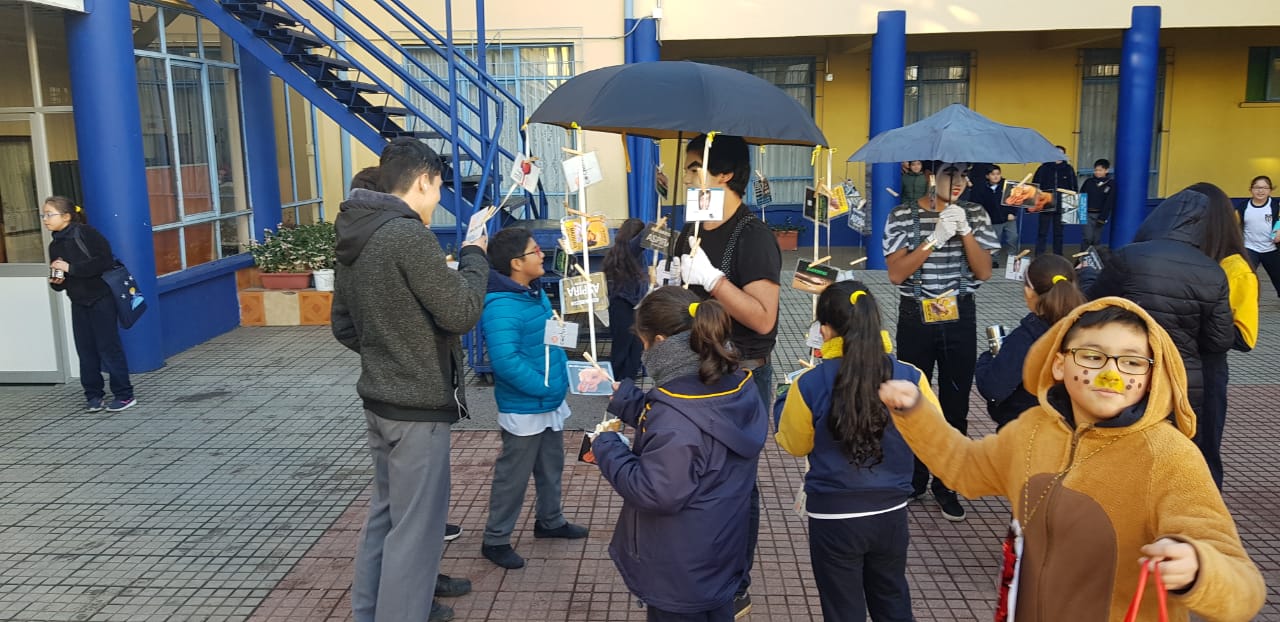 La inauguración de la feria estuvo a cargo de dos mimos de Segundo Medio y la mascota de Convivencia, quienes invitaron a la comunidad a visitar la muestra, que se ubicó en parte del hall y otra sección en el salón multiuso arriba del casino.